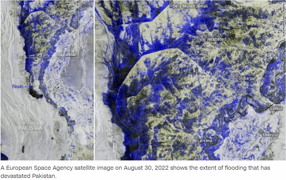 因此,通胀已经成为一个持续的问题,由此引发的利率上升可能会成为全球经济衰退的下一个触发点。我们将在最后讨论这个问题。现在我想讨论气候变化的话题,正如标题所示,由气候引发的危机在本质上已经加剧 - 也就是说,影响超越了气候本身,扰乱了整个政治经济,无论是在地区、国家还是发生这种情况的地方。目前在巴基斯坦发生的情况就是一个很好的例子。该国正面临着末日般的洪水。根据欧洲空间局(ESA)的估计,几乎有三分之一的国土被淹没。已经有超过1,100人死亡,其中400人是儿童。大约有3300万人被迫离开家园 - 这占了总人口的三分之一!根据联合国的数据,有超过640万人急需帮助。