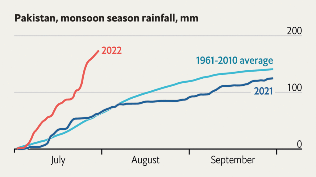 巴基斯坦正在经历异常的降雨量 - 是正常水平的10倍,导致了印度河的溢出。在该国的一些地区,如信德和俾路支斯坦,降雨量是平均水平的500%。《经济学人》的这张图表很有说明性!