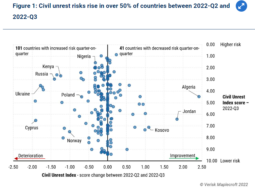 当前通胀压力的一个副产品是社会动荡的增加。根据Maplecroft的分析,大约有101个国家面临着动荡的增加。欧盟,斯里兰卡,秘鲁,巴基斯坦,肯尼亚,厄瓜多尔,伊朗和许多其他国家都在看到抗议活动的增加,原因是生活成本的上升。劳动激进主义也在增加。目前全球有超过80个国家的通胀率超过6%。