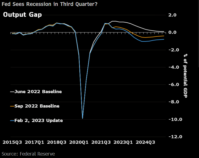 Anna Wong(Twitter用户名:@AnnaEconomist)在她的推文中提出了一些有趣的观点,她展示了联邦储备系统预期经济将进一步下滑,如下图所示的产出缺口。