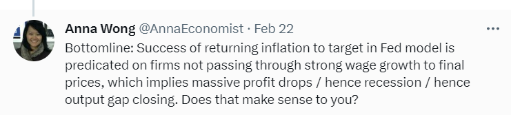 所以,根据Anna的说法,联邦储备系统预计将把通胀目标调整到2%,这是基于公司不会将工资增长传递给消费者的假设,但等等!这不会降低利润和产出,这不就是所谓的衰退吗?她问了同样的问题。