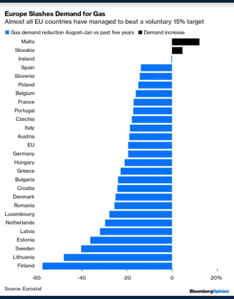 我想从这个非常有趣的图表开始,它展示了欧盟为减少其天然气消耗量做出的英勇努力,减少了19%,这甚至超过了政府规定的15%。