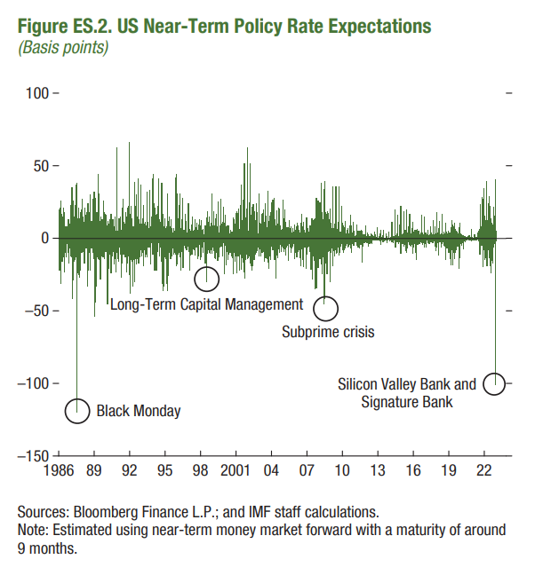 2023年的经济轨迹一直动荡不安,以高通胀和金融部门的动荡为标志。《全球金融稳定报告》试图捕捉这一轨迹,其特点是更高的通胀和利率,以及像美国的硅谷银行和Signature Bank等知名银行的失败,以及市场对欧洲瑞士信贷的信心丧失。这些事件揭示了更紧的货币和金融条件与脆弱性积累之间的互动所带来的挑战,这些挑战继续对全球金融稳定构成持续威胁。这些事件的影响力,类似于1987年的黑色星期一崩盘,导致了风险资产的抛售和货币政策利率预期的大幅重新定价。