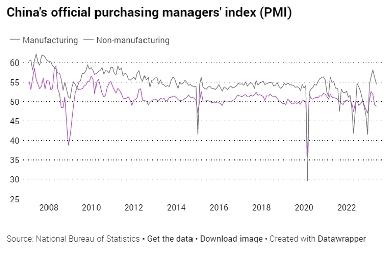 最近的数据显示,中国制造业活动出现了显著的下滑,达到了该国解封后的最低点。官方统计数据显示,制造业采购经理人指数(PMI)为48.8,低于4月份的49.2,这表明经济表现持续下滑。与此同时,非官方制造业PMI从4月份的56.4下降到5月份的54.5,这是过去一个季度以来的最弱表现。