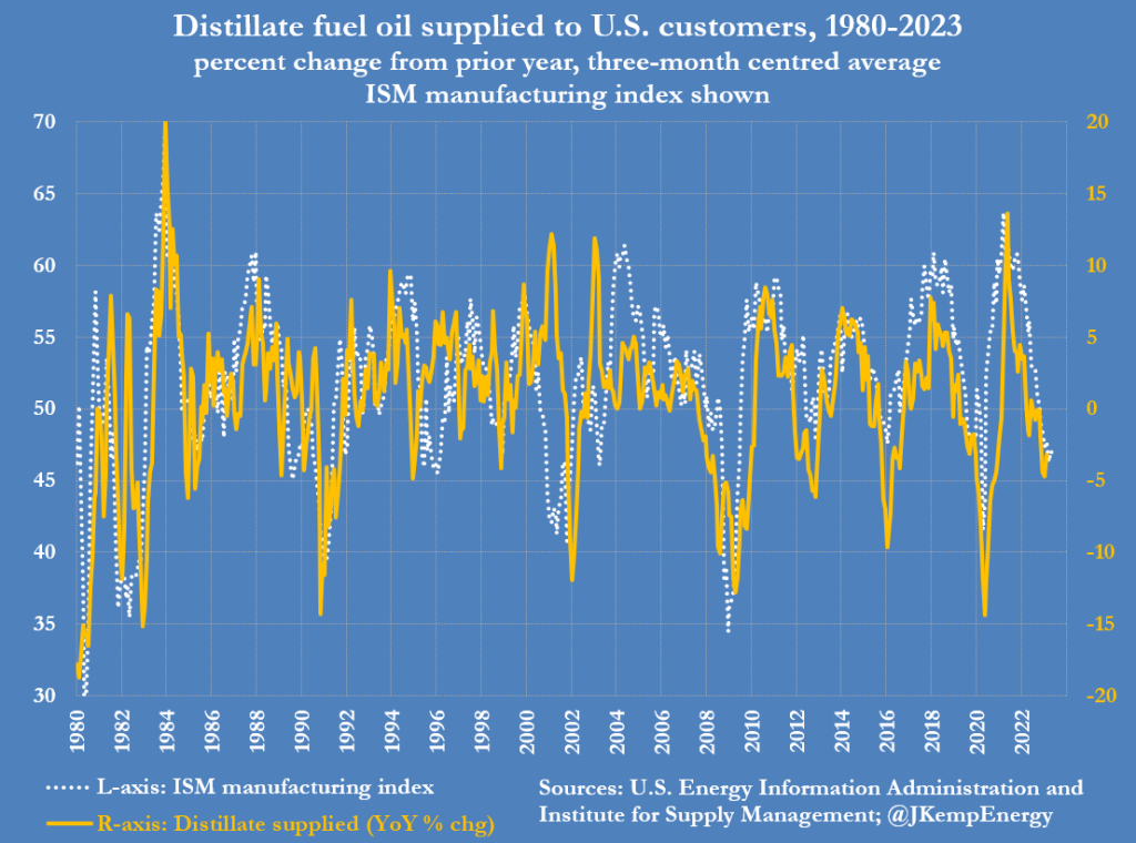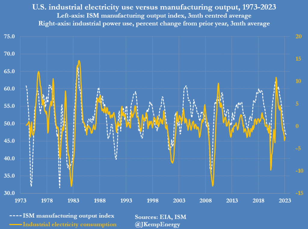 美国的制造业和货运活动在过去七个月中一直呈下降趋势。这种下滑明显影响了对柴油和其他馏分燃料油的需求,也影响了工业电力的使用。