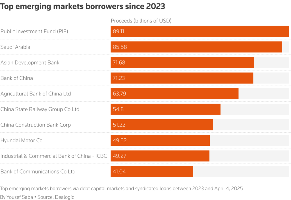 这一切都发生在油价暴跌的背景下——布伦特原油价格最近跌破每桶 60 美元,为 2021 年初以来最低,这一变化对依赖石油收入的经济体产生了巨大冲击。从沙特阿拉伯到委内瑞拉,许多产油国都在紧急填补财政缺口。例如,沙特已重返债券市场,仅 4 月就发行了近 10 亿美元的伊斯兰债券(sukuk)。这延续了该国自去年以来的激进借债策略,当时沙特是新兴市场中债务发行最多的国家之一。沙特的“2030 愿景”雄心勃勃,但石油收入减少和阿美公司派息缩水迫使政府重新审视部分时间表。政府正试图在不阻碍经济多元化的前提下平衡预算,但显然需要重新校准。