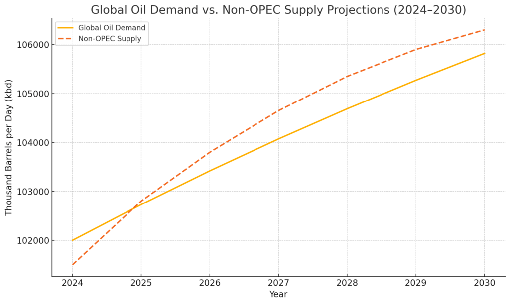 - 非 OPEC 供应增长:2025 年 +130 万桶/天,2027 年降至 +80 万桶/天,之后逐步减少