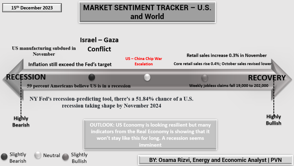 截至2023年12月15日的美国市场情绪追踪器显示,经济处于十字路口,指标既显示出谨慎,也显示出适度的乐观。