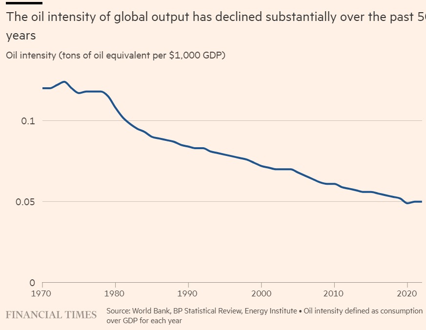 尽管冲突仍在进行,但影响油价的一个原因是全球产出的石油强度自1970年代以来已经减少了近60%,并且由于供应来源的多样化,战略储备的增加,以及通过国际能源署的更好协调,石油市场变得不那么脆弱。