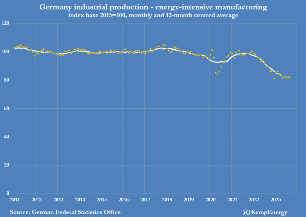 欧元区继续面临多重挑战,我在之前的研究中已经强调过这一点。看看下面的图表。它显示,在9月份,德国的能源密集型制造业继续经历生产下滑。自2022年初以来,产出已经下降了17%,并且没有迹象表明即将恢复。天然气和电力的高昂成本使得这些依赖能源的行业越来越难以保持竞争力。