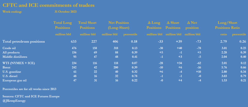 此外,对冲基金对柴油和其他中间馏分燃料的未来价格越来越悲观。这些类型的燃料与经济趋势密切相关,受到主要经济体利率上升和借款成本增加的影响。在过去的九周中,除了一周外,这些基金一直在抛售他们在中间馏分中的持仓,自8月底以来,他们的总持仓已减少了5600万桶。
