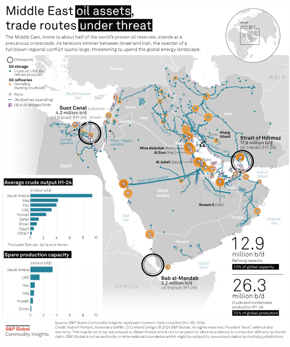 我采访了《Petroleum Economist》主编 Paul Hickin,询问他是否认为油价会进入三位数。他表示:“如果原油出口基础设施遭到攻击,或关键水道运输中断,那么油价将迅速突破每桶 100 美元,甚至可能继续飙升。但没人希望这种情况发生,这也是为什么目前的风险溢价相对温和。市场还有大量备用产能,这在一定程度上是一种保障,但由于大部分备用产能都集中在中东地区,也使得风险管理变得更复杂。最终,即使发生大幅飙升,可能也只是短期的,因为如果事态升级到影响供应的程度,美国很可能会直接介入,以迅速平息局势。”