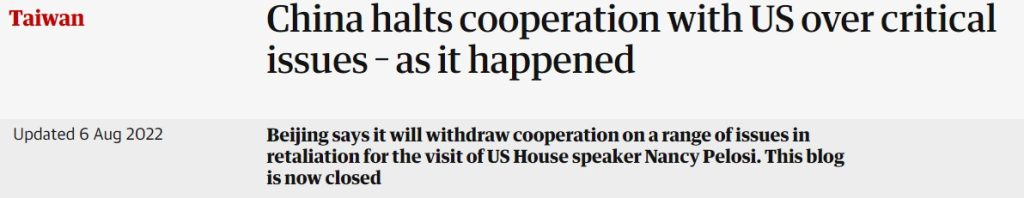 南希·佩洛西访华引来了各种评论。我个人的观点是,这次访问不仅计划不周,而且鉴于世界所处的地缘政治背景,这次访问是不必要的。中国以行动和言辞做出了强烈、严格的回应。中国告诉美国,“玩火者自焚”,并表示“我们希望美国能理解这一点”。中国还进行了军事演习,并重申了如果不能通过和平手段,那么就用武力兼并台湾的立场。