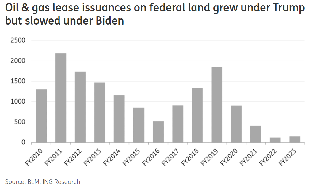 特朗普能源议程的核心是他著名的“猛钻、猛钻、猛钻”口号。类似他第一个任期,美国一度成为全球最大的石油生产国,原油产量创历史新高。他承诺将进一步推动美国石油与天然气钻探,通过削减监管障碍和扩大联邦土地租赁来实现,尤其是推翻拜登政府实施的诸多限制。在特朗普任期内,美国共发放超过 4000 份油气租约,而拜登任内仅为约 1400 份。这种联邦土地租赁的回归可能显著提高目前占美国石油产量约 12% 的联邦区域产量,尽管其效果可能需要时间才能完全显现。