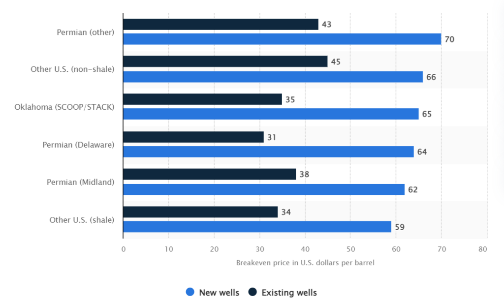 来源:Statista – 截至 2024 年美国主要油田按井类型所需的平均盈亏平衡 WTI 价格