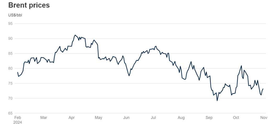 另一个重要变量是特朗普对伊朗的政策立场。在其首个任期内,他重新实施对伊朗石油出口的严厉制裁,使全球市场每日减少逾 100 万桶供应。拜登上任后,这些制裁执行相对宽松,使伊朗出口量大增。如果特朗普再次上台并恢复强硬制裁,全球供应可能再度紧缩,油价将被推高。2025 年 Brent 原油当前预测价为每桶 72 美元,一旦政策转向,价格或大幅上涨。然而,这也可能令特朗普陷入两难局面:一方面推动全球油价上扬,另一方面又需维持国内能源价格的稳定。